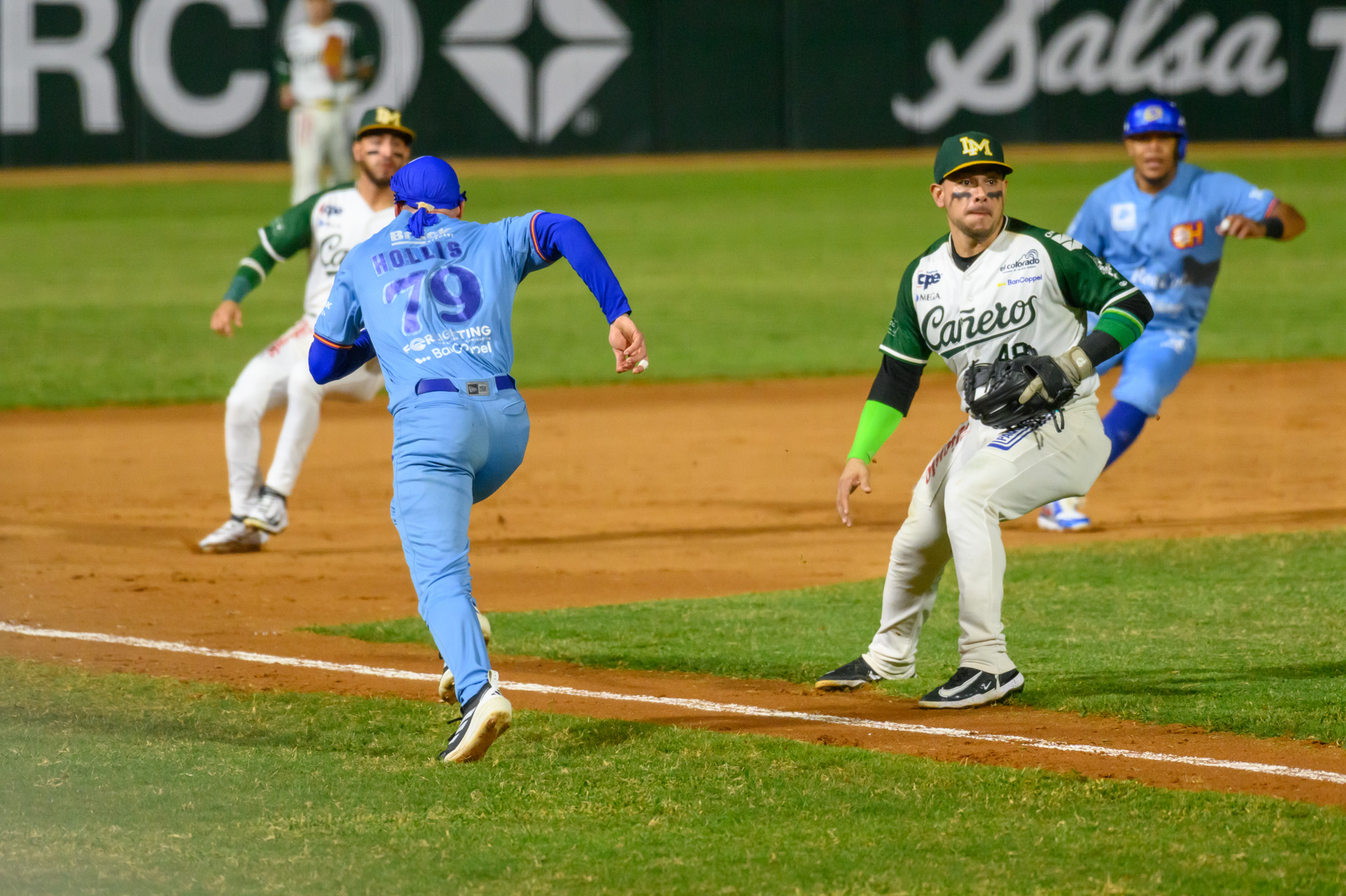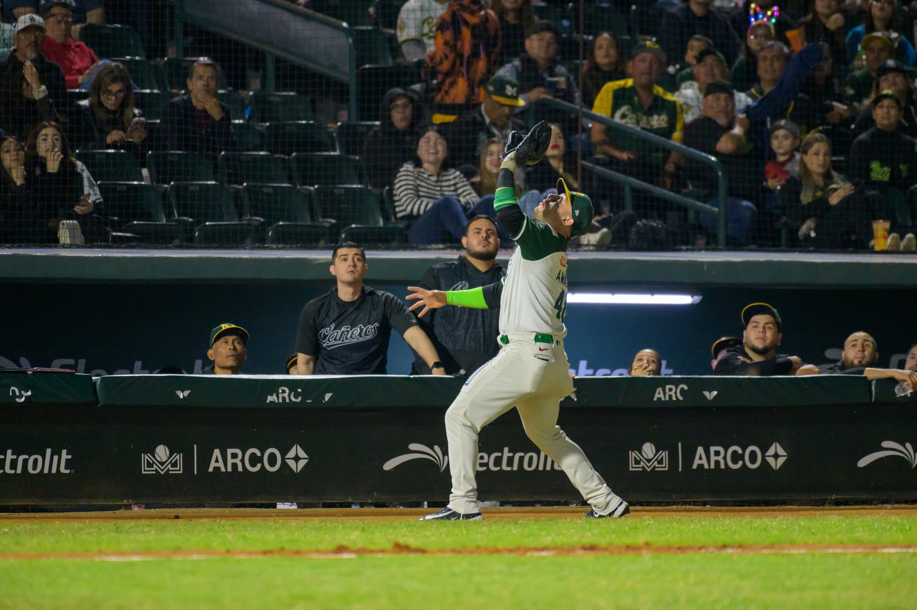 Los verdes tuvieron que esperar hasta el cierre de la octava para poder decir presente; con bases llenas y un out Rodolfo Amador bateó una rola al cuadro de botes altos con la cual se descolgó Alejo López para emparejar el marcador.